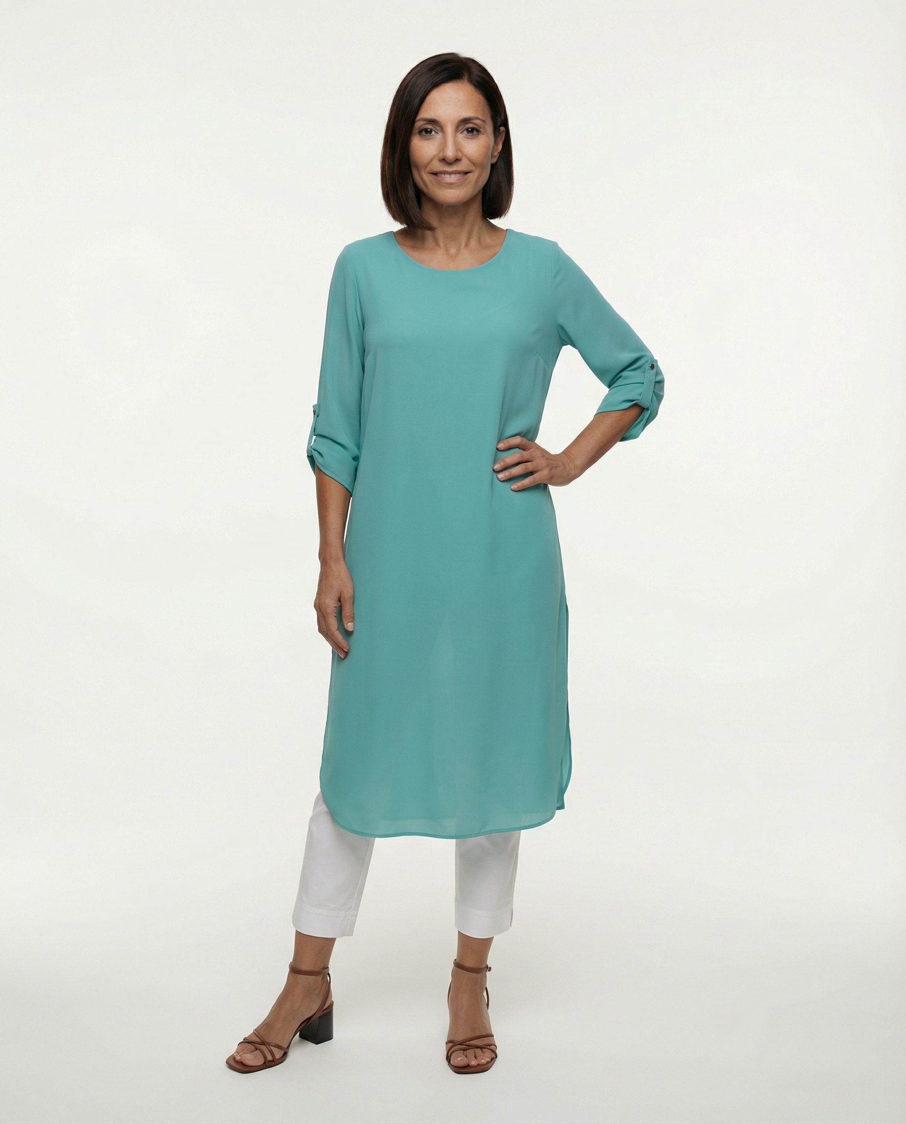 Diese zeitlose Damenbluse aus fließendem Chiffon ist ein echtes Must-have für stilbewusste Frauen. Durch den geraden Schnitt und die weiche Qualität schmeichelt sie der Figur und bietet hohen Tragekomfort. Die 3/4-Ärmel lassen sich dank der Lasche variabel hochkrempeln, sodass sich die Bluse perfekt an verschiedene Looks anpassen lässt. Der gerundete Saum und die verlängerte Rückenpartie sorgen für eine moderne, elegante Optik. Ideal für Damenmode, die sowohl schick als auch alltagstauglich ist.