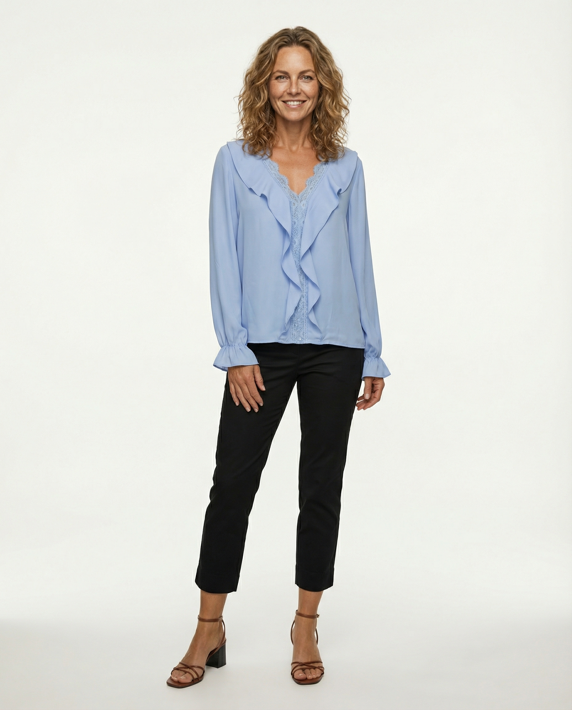 Dieses elegante Chiffon-Blusenshirt für Damen vereint feminine Details wie zarte Volants und Spitzenbesätze mit einer fließenden, angenehm leichten Qualität. Ideal für Damenmode mit einem Hauch italienischer Raffinesse.