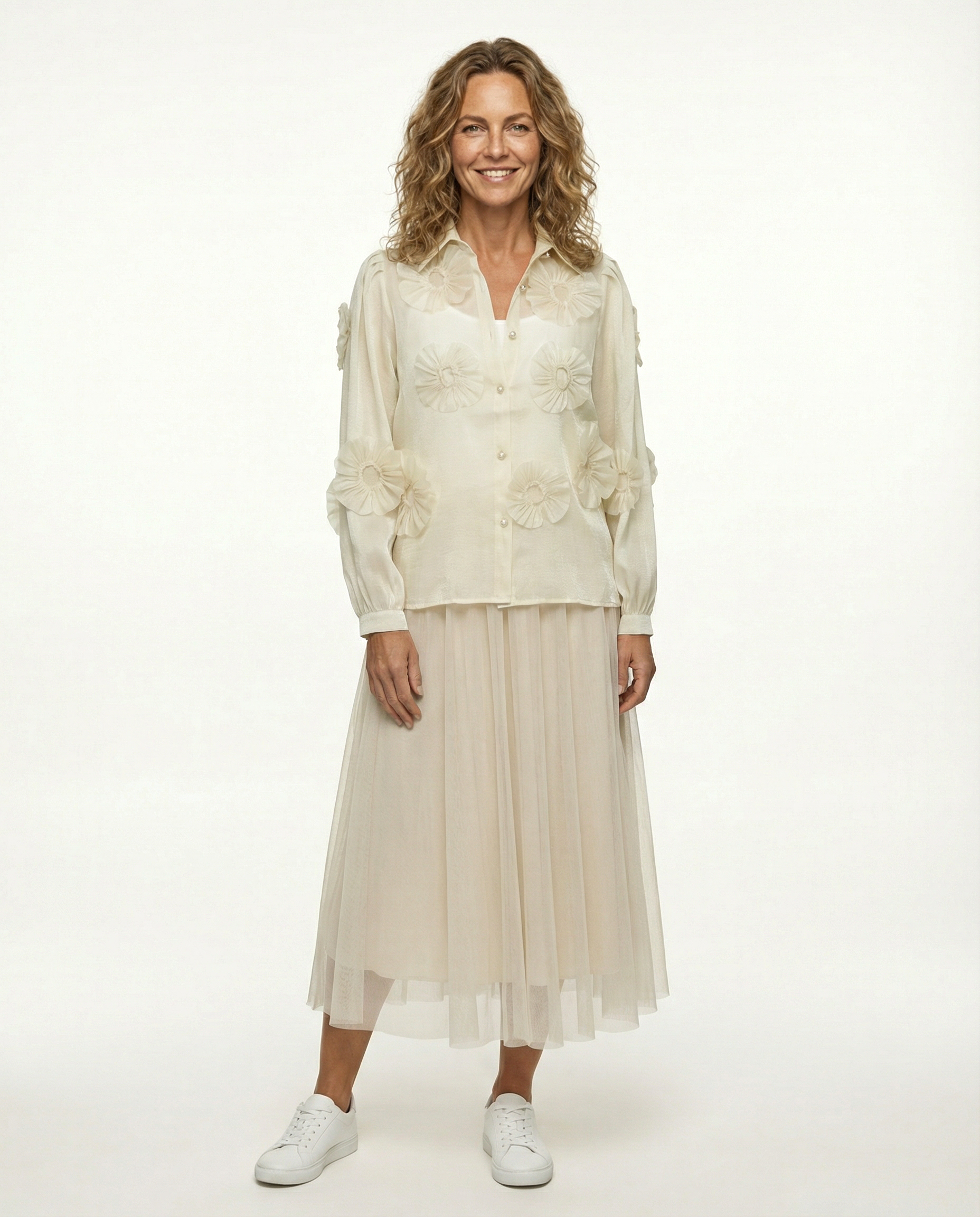 • Blumen-Applikationen an den Ärmeln und auf der Front