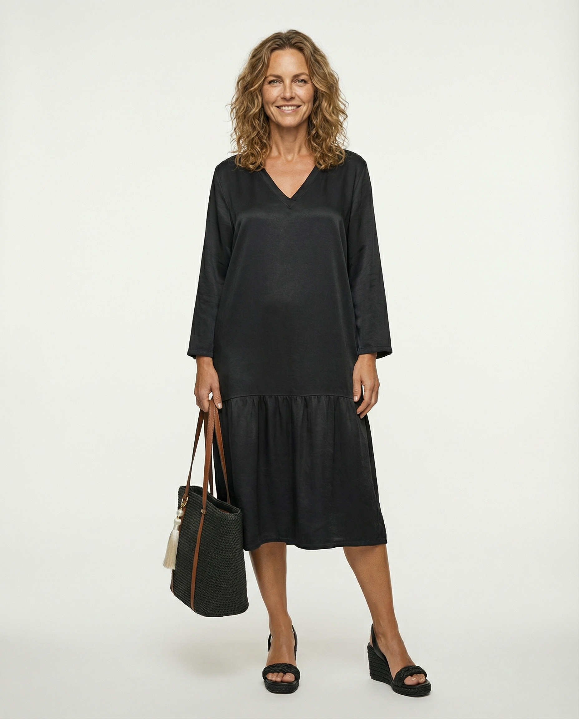 Attraktives Kleid von Pronto Moda aus Italien in schwarz. Legeres Kleid mit Seide in gerader Schnittführung mit V-Ausschnitt, 3/4 Armlänge und dezentem Volant. Fließende Qualität mit dezentem Seidenglanz, ungefüttert und waschbar. Auch mit Gürtel tragbar.