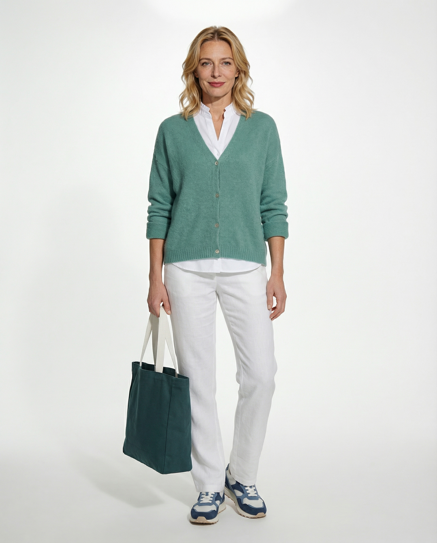 Die hellblaue Damen-Strickjacke aus hochwertigem Materialmix mit Alpaka und Wolle vereint Komfort und Stil auf perfekte Weise. Der lockere, gerade Schnitt sorgt für eine lässige Passform, während der tiefe V-Ausschnitt eine feminine Note verleiht. Die edlen Perlmuttknöpfe setzen elegante Akzente und runden das Design harmonisch ab. Dank der weichen, nicht kratzenden Qualität bietet die Jacke einen angenehmen Tragekomfort und eignet sich ideal für kühle Tage. Kombinieren Sie sie vielseitig – von casual bis elegant.