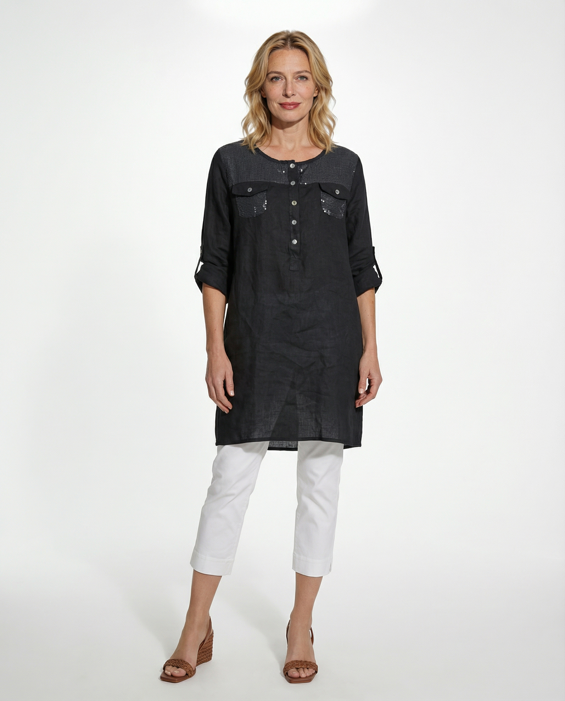 Schicke Tunika von Diana aus Italien in anthrazit. Edle Tunika im Blusenstil aus Leinen in legerer gerader Schnittführung. Mit dezenten Pailletten verziert. Seitliche Eingrifftaschen und Ärmel mit Turn-Up Funktion. Angenehme weiche Leinenqualität.